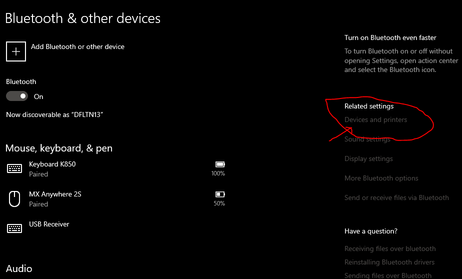 2. When in the Bluetooth and other devices panel, click on Devices and printers. It is under “Related Settings” to the right.