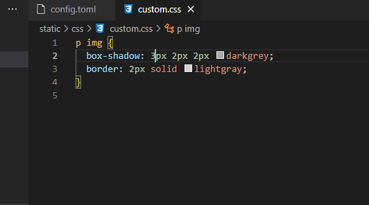 In the screenshot below, you can see that I wanted to put a border and box shadow on all image elements inside a paragraph (p tag).
